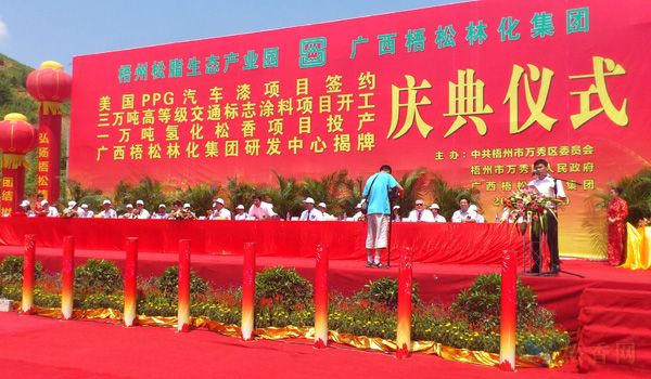 自治區(qū)副主席楊道喜、梧州市委書記、市人大常委會(huì)主任劉志勇、梧州市委副書記、市長王凱、梧州市政協(xié)主席吳漢華、梧州市人大常委會(huì)副主任李奕權(quán)及市直、中直、區(qū)直有關(guān)部門領(lǐng)導(dǎo)、萬秀區(qū)四家班子等領(lǐng)導(dǎo)出席慶典。自治區(qū)副主席楊道喜宣布三萬噸高等級(jí)交通標(biāo)志涂料項(xiàng)目開工暨一萬噸氫化松香項(xiàng)目投產(chǎn),并與劉志勇書記共同為廣西梧松林化集團(tuán)研發(fā)中心、國家高新技術(shù)企業(yè)揭牌;合作方美國PPG工業(yè)集團(tuán)汽車漆全球運(yùn)營總監(jiān)卡里根·拉里及亞太區(qū)、中國區(qū)相關(guān)負(fù)責(zé)人、瑞典Colorpoint交通漆(彩點(diǎn)公司)總經(jīng)理湯尼斯·安尼特等外商出席并與梧松集團(tuán)董事長孔仕才簽署合作協(xié)議。