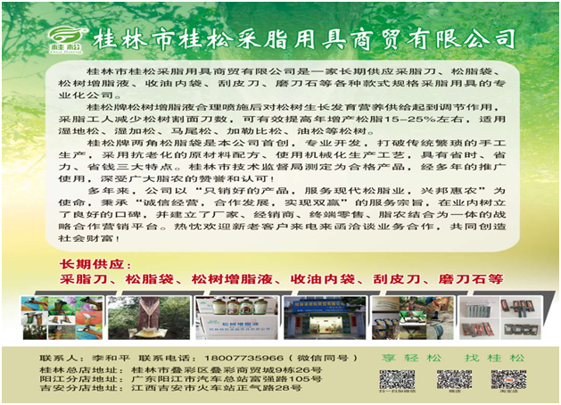 2、采脂工效的問題。工具:機(jī)械化、減少采脂工序。(預(yù)制割面、安導(dǎo)脂器、安受脂器三序合一?)。促脂劑:規(guī)范產(chǎn)品、國家或行業(yè)標(biāo)準(zhǔn)。