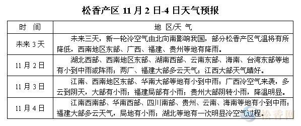 華訊松香網(wǎng)溫馨提醒:未來(lái)三日,新一輪冷空氣將由北至南影響我國(guó),部分松香產(chǎn)區(qū)降溫明顯,另廣西、云南、福建、貴州等地迎來(lái)小到中雨,降溫降雨天氣或使得松脂工生產(chǎn)積極性降低,市場(chǎng)松脂量或仍維持緩慢釋放狀態(tài)。