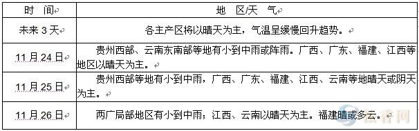 華訊松香網(wǎng)提醒:未來三天,各松香產(chǎn)區(qū)以晴天為主,氣溫呈緩慢回升趨勢。湖北、貴州等地產(chǎn)季基本結(jié)束,兩廣、福建、江西等產(chǎn)區(qū)接近尾期,晴好天氣利于松脂的采收和運輸。