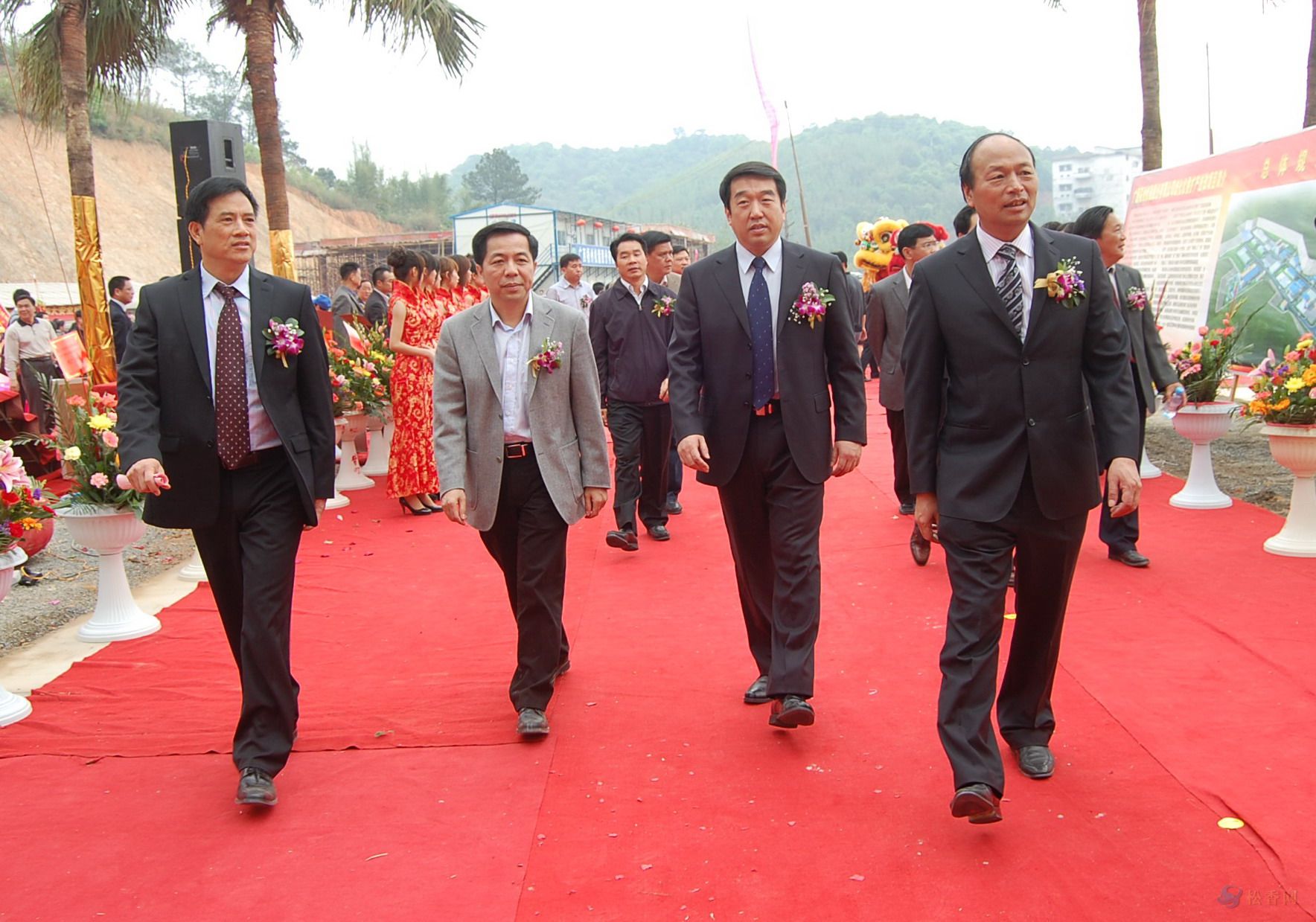 中共梧州市委書記劉志勇(右二)、廣西區(qū)工信委副主任潘峰(左二)于2010年3月31日在廣西梧州松脂股份有限公司歧化擴(kuò)產(chǎn)技改投產(chǎn)慶典儀式上與公司董事長(zhǎng)孔仕才(右一)總經(jīng)理車乾池(左一)在一起。