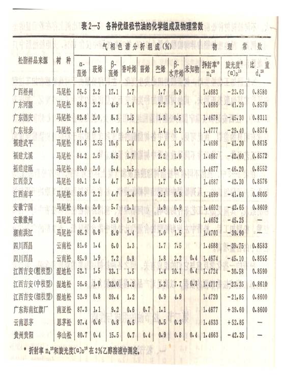 1979年中國林業(yè)科學(xué)研究院林產(chǎn)化學(xué)工業(yè)研究所采用氣相色譜法分析了我國一些松樹品種松脂中松節(jié)油(優(yōu)油)的組成,其結(jié)果見表2—3。