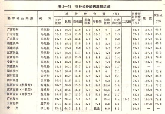 1 979年,中國林業(yè)科學(xué)研究院林產(chǎn)化學(xué)工業(yè)研究所在實驗室分析了馬尾松、云南松、思茅松、華山松、濕地松松香的樹脂酸組成。松脂在減壓蒸餾(壓力200毫米汞柱)下收集松節(jié)油(相當(dāng)于松節(jié)油175℃左右的餾份)后,釜殘即作為松香樣品進(jìn)行樹脂酸含量的測定,其結(jié)果列于表2—15。由于松脂的含油量和蒸餾終點不一,因此松香的軟化點、酸值出入較大。