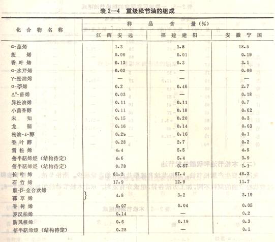 1980年,中國林業(yè)科學(xué)研究院林產(chǎn)化學(xué)工業(yè)研究所采用氣相色譜儀與氣一質(zhì)聯(lián)用儀對馬尾松松脂中重級松節(jié)油(松脂水蒸汽蒸餾180—200℃的餾份)的組成進(jìn)行了研究。油樣取自工廠,分析的結(jié)果列于表2—4。