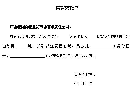 由于我方原因致使我方在特定條件下未能及時(shí)按照《松香預(yù)售合同》第四條有關(guān)規(guī)定通過(guò)貴公司松香電子交易系統(tǒng)進(jìn)行食糖銷(xiāo)售,因此,特委托貴公司通過(guò)我方 會(huì)員號(hào)進(jìn)行代理操作,該操作視同我方交易。我方承諾按照市場(chǎng)《交易規(guī)則》對(duì)此交易行為履行全部職責(zé)并承擔(dān)全部?jī)r(jià)格風(fēng)險(xiǎn)。