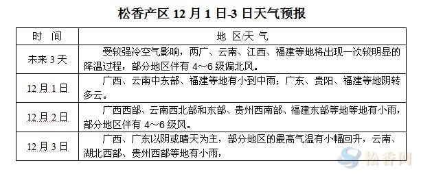 華訊松香網(wǎng)提醒:受較強(qiáng)冷空氣影響,未來(lái)三天,各產(chǎn)區(qū)均不同程度的降溫。福建、江西采脂進(jìn)入收尾階段,兩廣地區(qū)也進(jìn)入產(chǎn)季尾期,正陸續(xù)上山采脂的脂農(nóng)請(qǐng)注意氣溫下降對(duì)出脂的影響,以及大風(fēng)對(duì)松脂質(zhì)量的影響,合理安排采收。