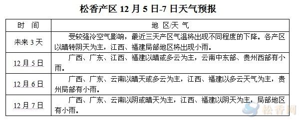 華訊松香網(wǎng)提醒:受較強(qiáng)冷空氣影響,未來三天,各產(chǎn)區(qū)均不同程度的降溫。各產(chǎn)區(qū)以多云天氣為主,降溫與陰天將對(duì)松脂出油量產(chǎn)生影響,仍在上山采脂的脂農(nóng)請(qǐng)注意天氣變化,合理安排采收。