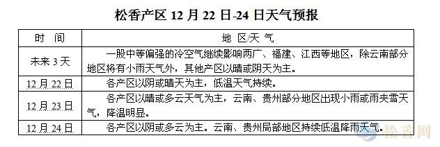 華訊松香網提醒:未來三天,各產區(qū)以晴或多云天氣為主,云南、貴州局部地區(qū)將出現(xiàn)降溫降雨。兩廣地區(qū)晴好天氣,利于最后一批松脂的采收。