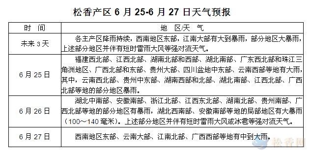 華訊松香網(wǎng)提醒:未來三天各產(chǎn)區(qū)降雨天氣持續(xù),部分地區(qū)強度略有趨弱,但總體未有明顯改觀。近期降雨天氣過于頻繁,端午期間粵桂贛等局地強降水造成的了較嚴重的洪澇災(zāi)害,受災(zāi)地區(qū)松脂采割及運輸工作將中斷一段時間。從目前天氣情況看,松脂短時間內(nèi)放量的可能性不大,且部分地區(qū)工廠或因脂量偏少略上調(diào)脂價以保證原料供應(yīng)。